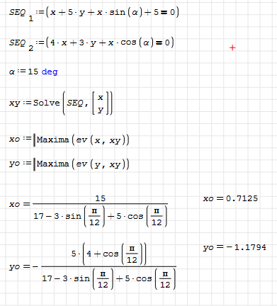 Hi Martin. I use Maxima's ev() because SMath's Assign() only works with the variable names, instead others, like xo, yo, and SMath's at() doesn't works for the symbolic evaluation, as shown this picture: