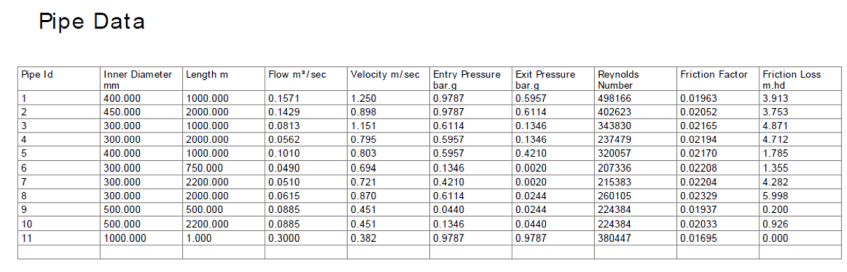 Can you please post the Pipe Data Table (with Pipe Number, Inner diameter, ..... Re, Friction Head loss)