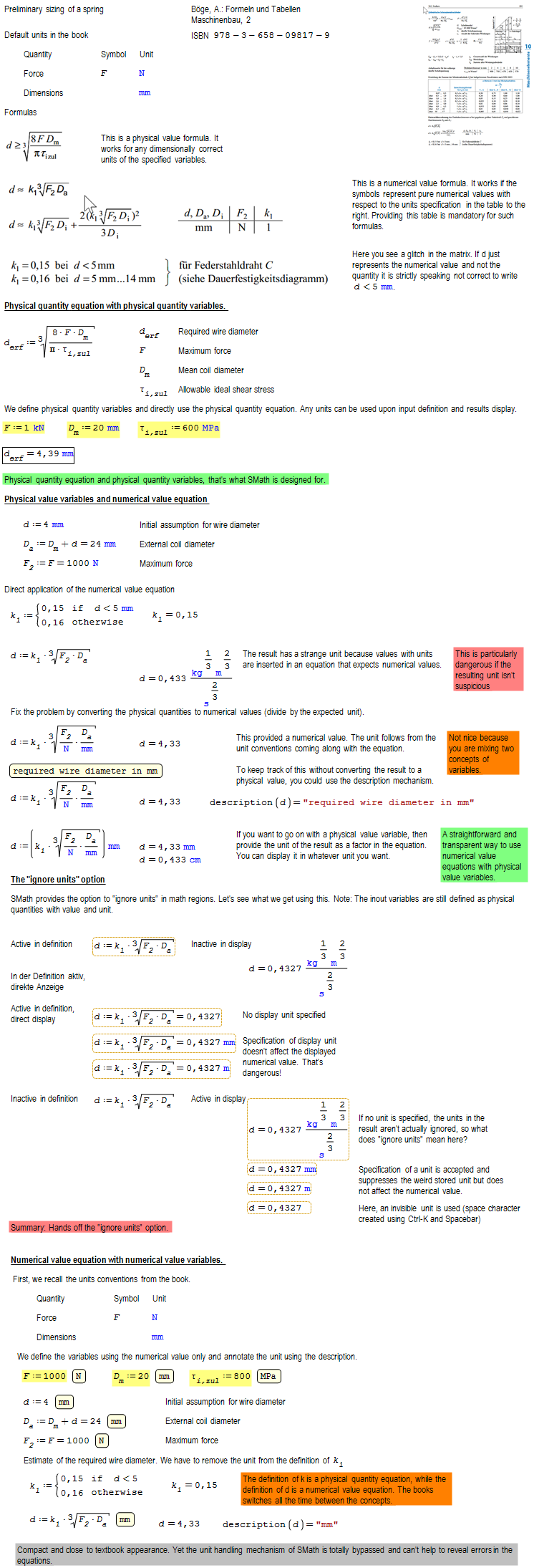 Here is an example based on a textbook. The book is a real challenge for SMath users, because it switches all the time between physical quantity equations and numerical value equation.