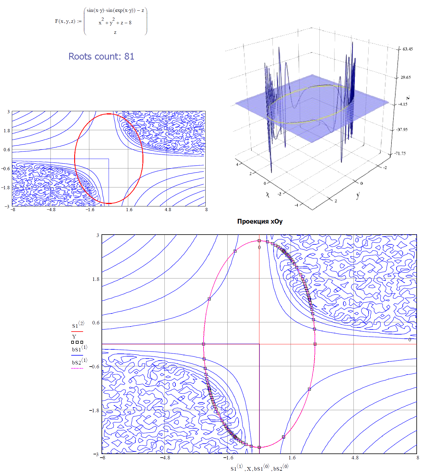 Roots count: 81 - this is not entirely true. In fact it is the number of solutions which found an algorithm, but it may be repeated. Here in the picture is a solution along the blue curve (3D). In places where it crosses zero, we find the roots.