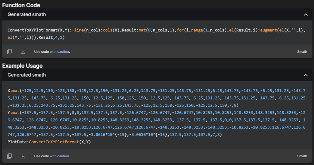 SMath Forum SMath Studio Questions smath plot error - 2-5 columns allowed 1 Pages (4 items) smath plot error - 2-5 columns allowed - smath plot error - Messages Go to last post #1 Posted: 8/3/2025 1:22:55 AM CBDL STRUCT SMATH 7 likes in 4 posts. Group: User I want to plot multiple polygons in the 2D plot simultaneously. However, I'm getting an error in the plot: 2-5 columns allowed. See the attached file2-5 cols allowed.sm (13.39 KiB) downloaded 743 time(s).Is there a way to do this in smath? I was able to plot a simultaneous unlimited number of polygons in Mathcad Prime without any problems, though. Thanks. #2 Posted: 8/3/2025 8:34:39 AM StvMath 43 likes and 1 dislikes in 68 posts. Group: User I think this should have been in the Questions section. However,2-5 cols allowed_b.sm (13.89 KiB) downloaded 747 time(s). #3 Posted: 8/3/2025 8:37:07 AM CBDL STRUCT SMATH 7 likes in 4 posts. Group: User Thanks. 😋 #4 Posted: 8/3/2025 9:23:12 AM Вячеслав Мезенцев 1,532 likes in 1,844 posts. Group: Moderator Now you can ask the AI, but it is still weak and can make mistakes.Manual modification is required.Links:1. AI-assistance-for-SMath Edited 8/3/2025 9:25:10 AM Russia ☭ forever, Viacheslav N. Mezentsev 1 Pages (4 items) New Posts No New Posts
