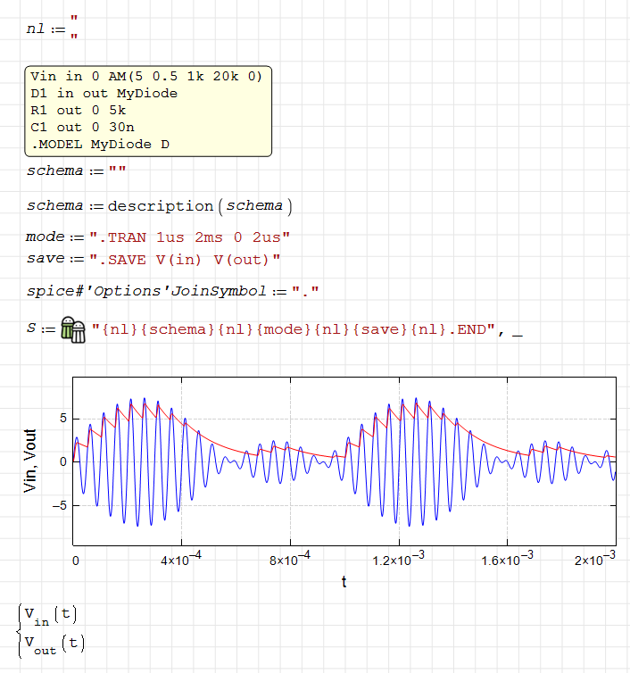 I haven't even tried these features myself yet. Support for all types of analysis hasn't been tested. There's still a lot of work to do. Maybe I'll do a direct insertion of values into the circuit description. I wanted to try making a circuit with an amplitude detector. The authors have recently added the ability to specify an amplitude-modulated signal. They have a shell (GUI) in which you can also test circuits.
