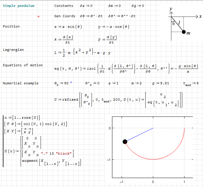 Форум SMath SMath Studio Samples Double pendulum model and animation 2 страниц (22 вхождений) Предыдущая 1 2 Double pendulum model and animation - Is the model correct? - Сообщения К последнему сообщению #21 Опубликовано: 06.11.2025 15:38:47 Alvaro 1 078 сообщений из 1 750 понравились пользователям. Группа: User Hi. Here it is.SimplePendulumLagrangian.sm (87,38 КиБ) скачан 332 раз(а).Best regards.Alvaro. #22 Опубликовано: 06.11.2025 22:41:17 Alvaro 1 078 сообщений из 1 750 понравились пользователям. Группа: User Hi. I added the method of using the solver block for the simple pendulum problem. It's always good to have more than one method for solving things.SimplePendulumLagrangian.sm (90,39 КиБ) скачан 313 раз(а).Best regards.Alvaro. 2 страниц (22 вхождений) Предыдущая 1 2 Новые сообщения Нет новых сообщений