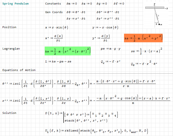 Something similar applies to the pendulum with a spring. Note that the Lagrange equations become somewhat complicated because I use the x,y coordinates to calculate the kinetic energy, and SMath cannot simplify trigonometric functions. However, if you use r, θ' (in green), the equations of motion are greatly simplified. But that breaks the principle that the program should do the calculations, not the user.