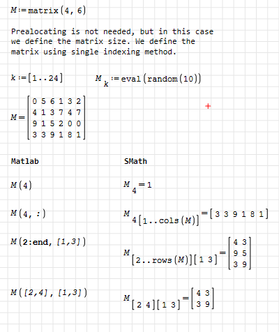 Hi. I think matrix indexing in SMath is more convenient to think of in terms of its Matlab analogy, rather than Mathcad.